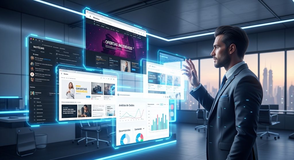 Um estrategista digital em um escritório futurista observando vários hologramas de sites.