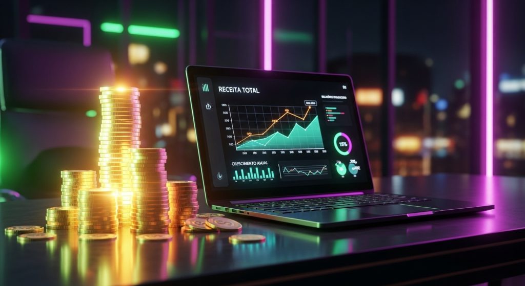 Uma pilha de moedas de ouro digitais crescendo ao lado de um notebook em um ambiente luxuoso.